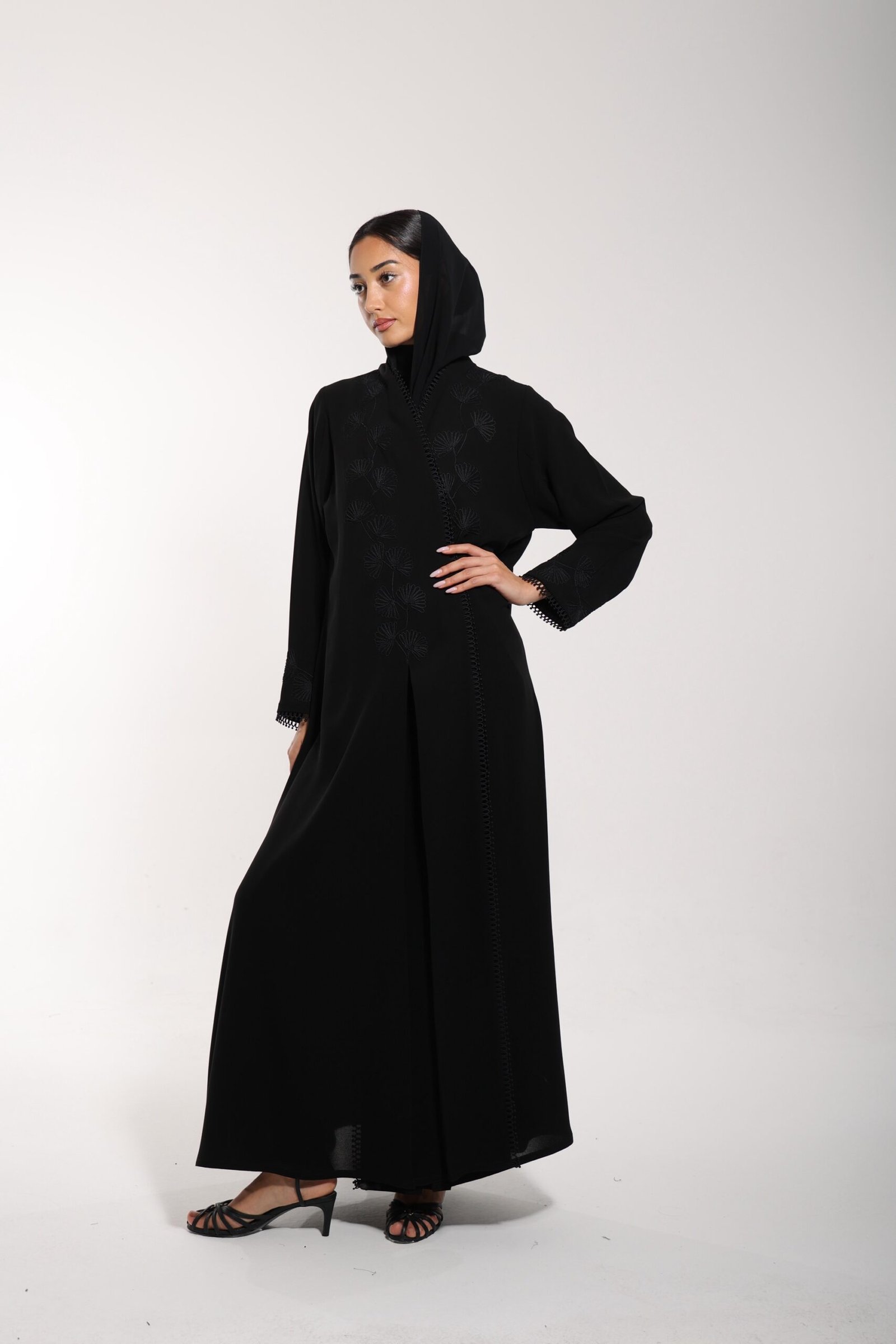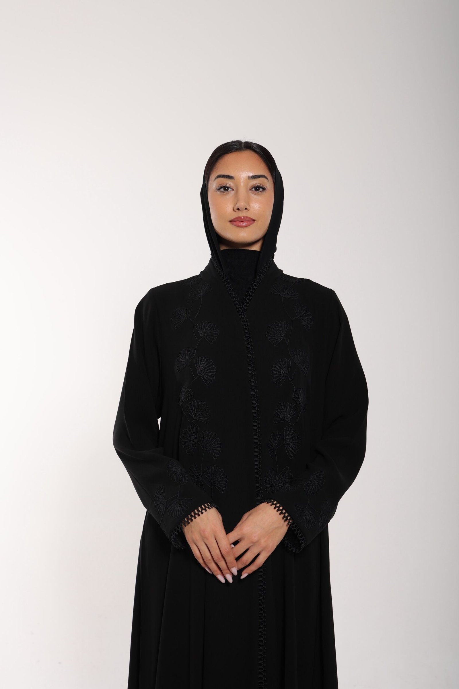 Crafted from premium Korean crepe, this fully lined abaya features authentic Moroccan embroidery in an elegant black-on-black finish.