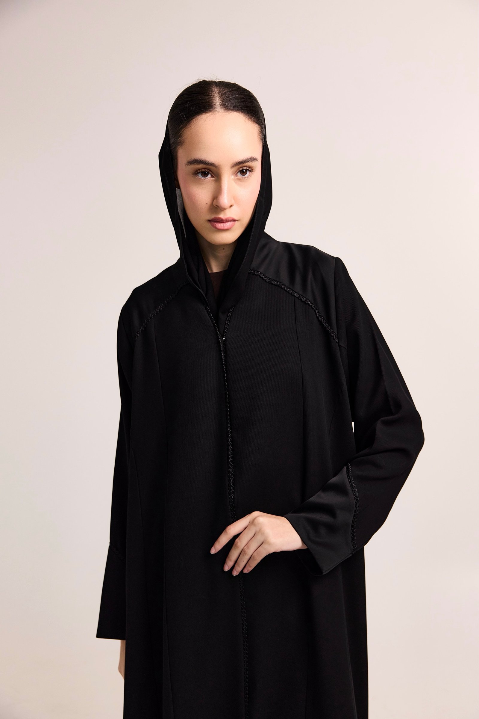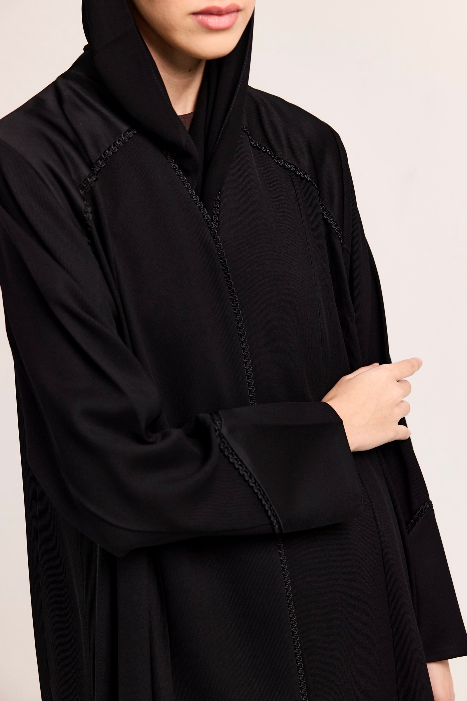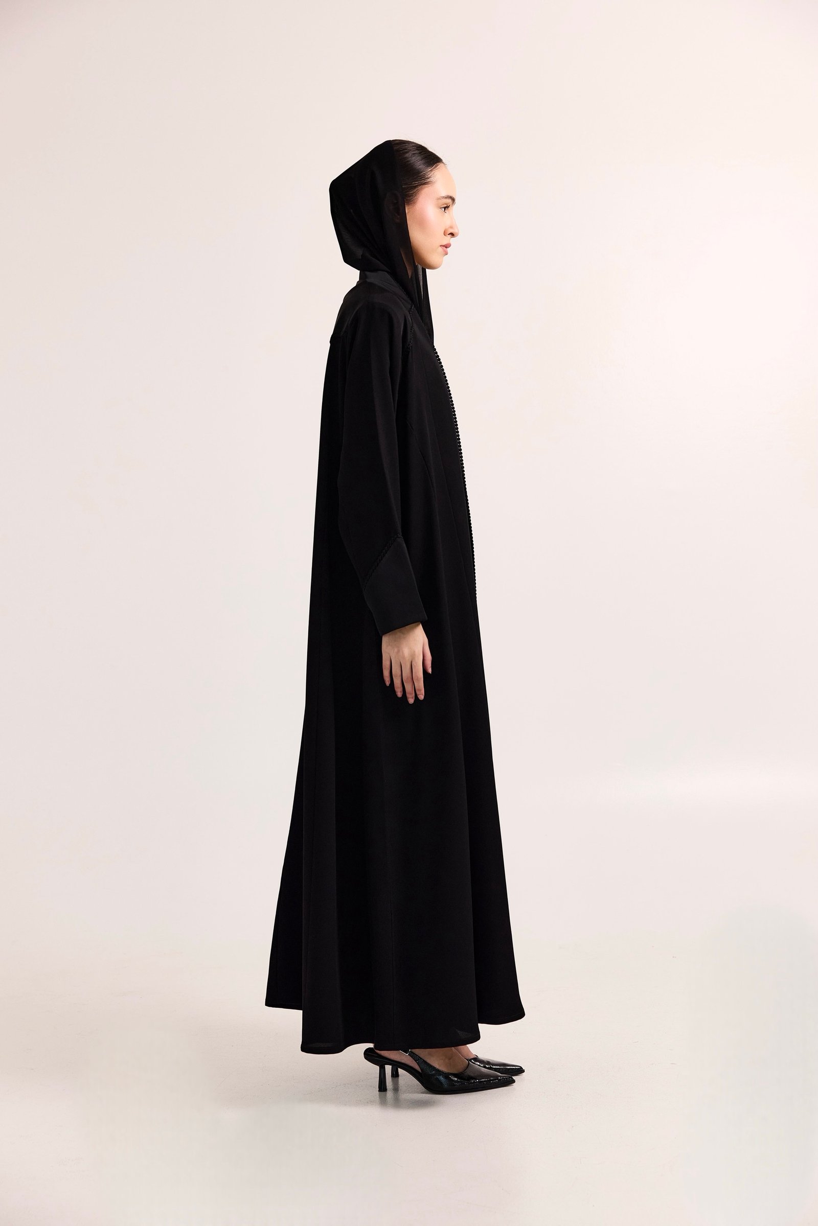 A refined black abaya crafted from smooth, lightweight fabric with a soft satin finish.