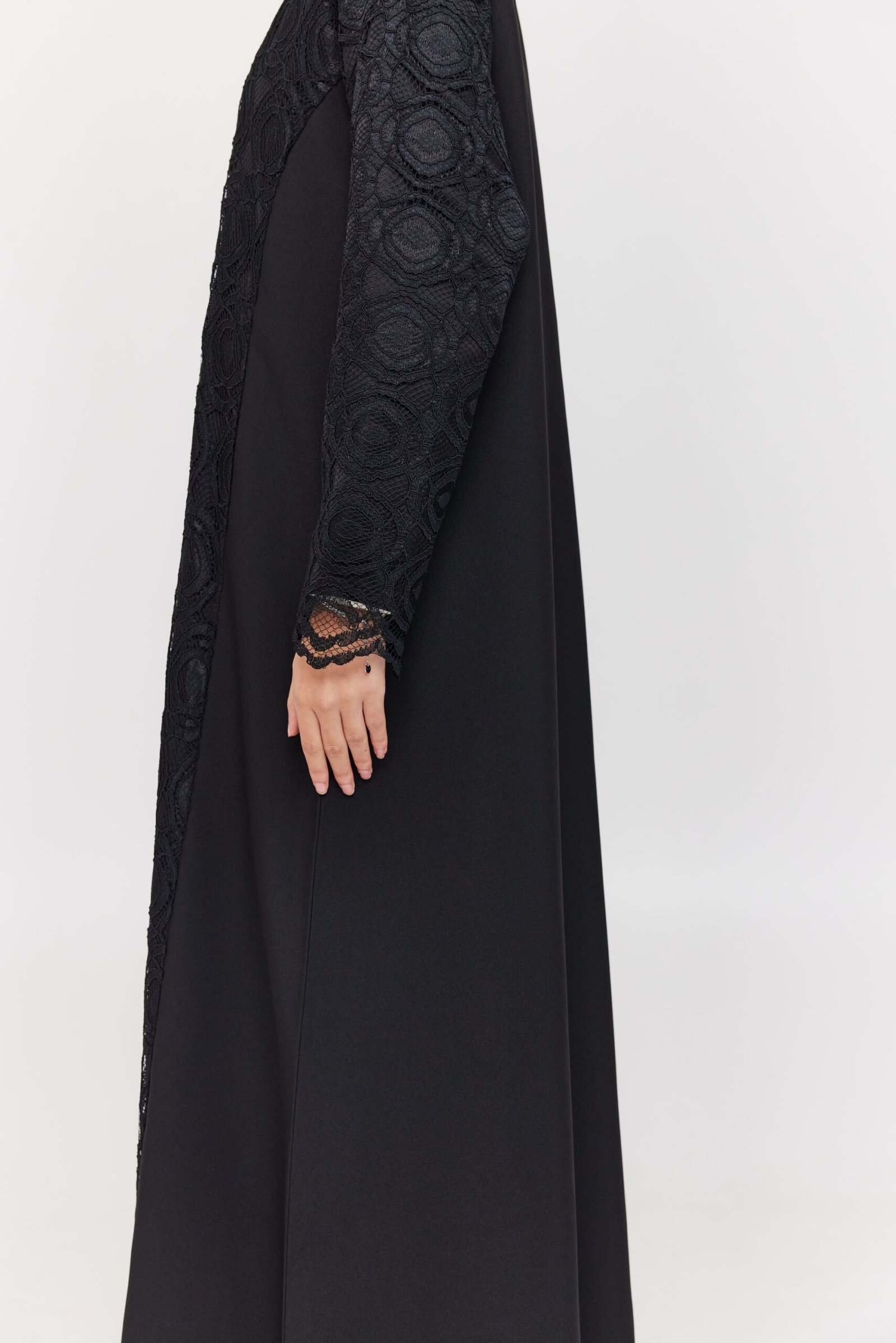 A timeless Korean crepe abaya with full lace detailing along the front and sleeves — elegant, feminine, and effortlessly chic.