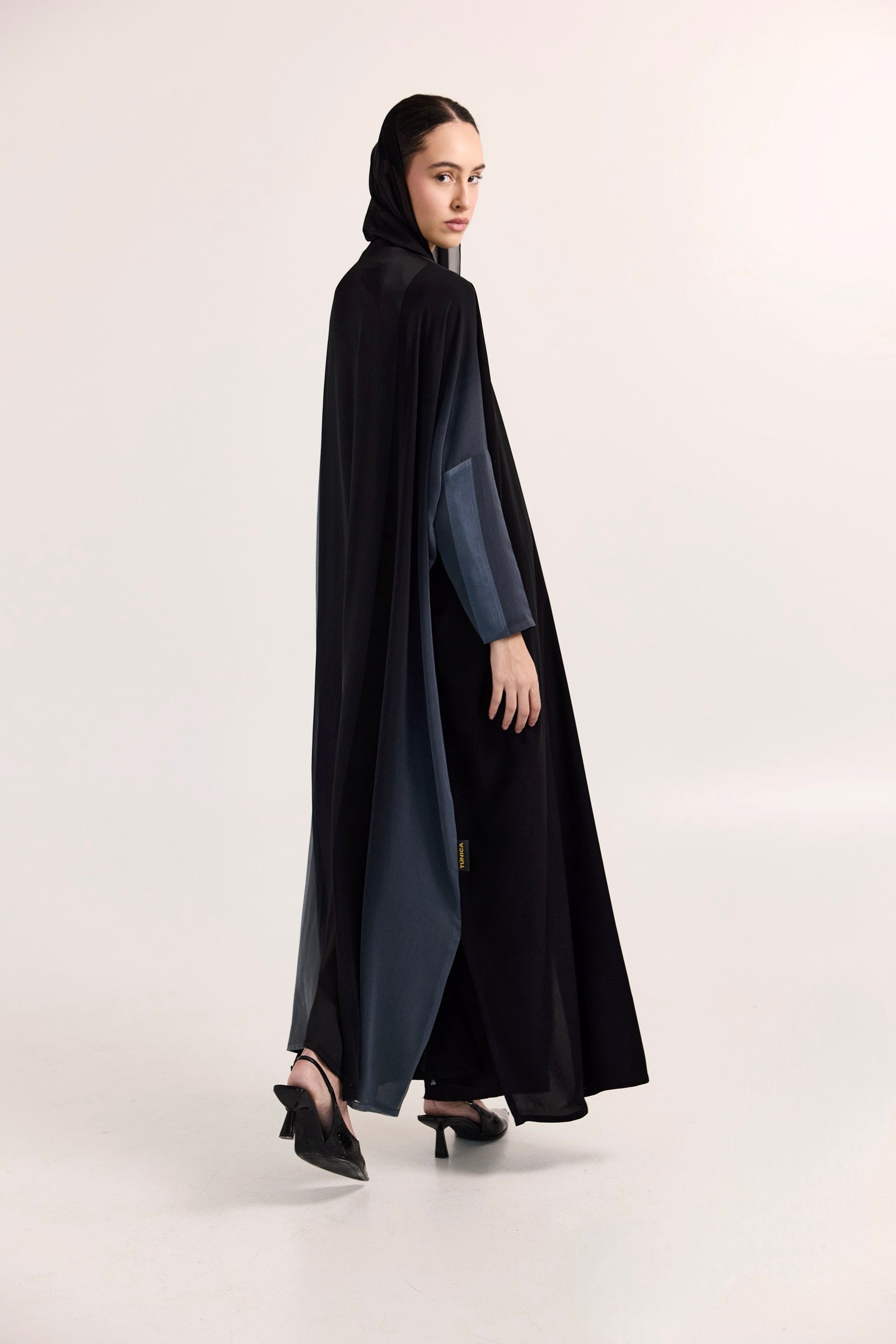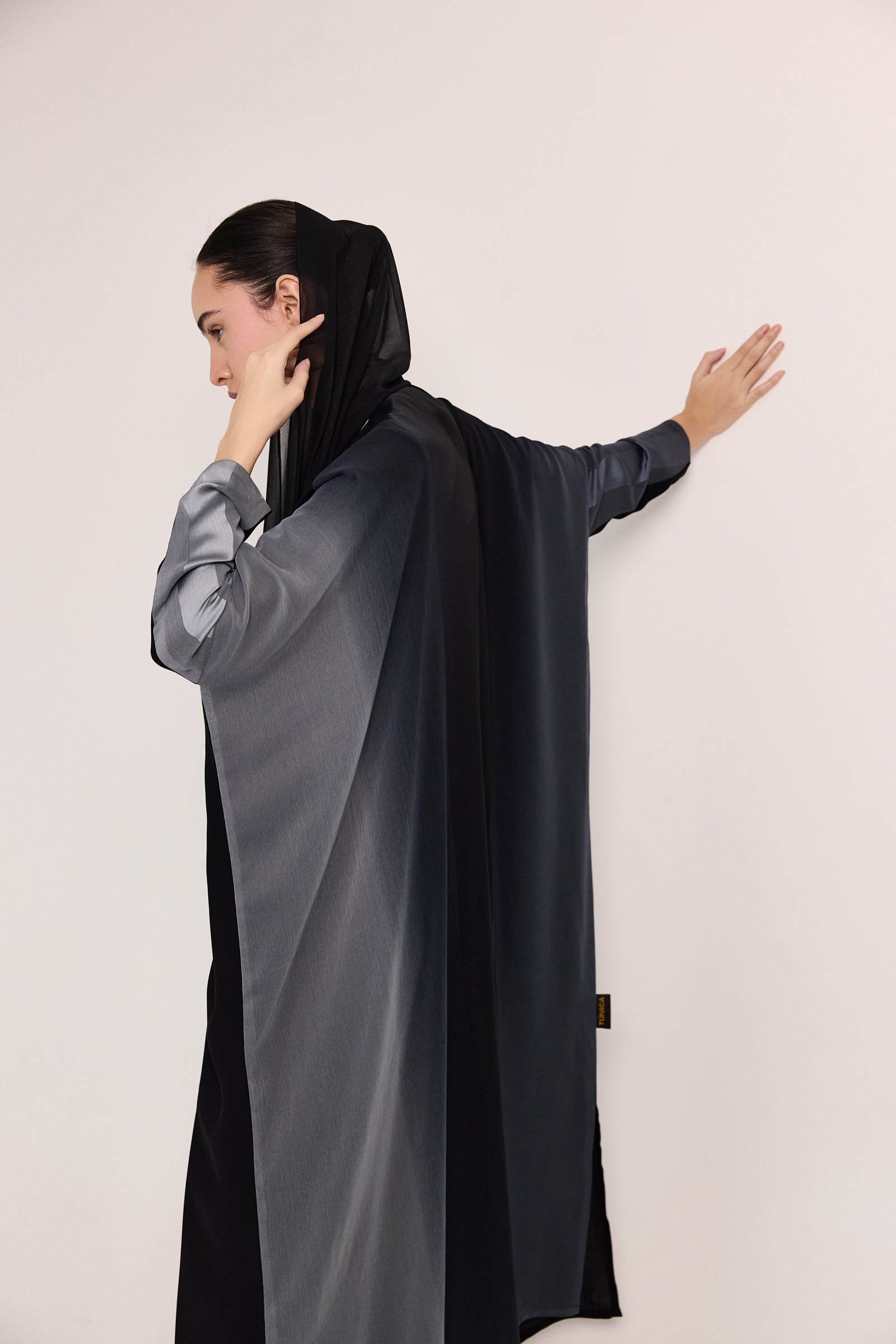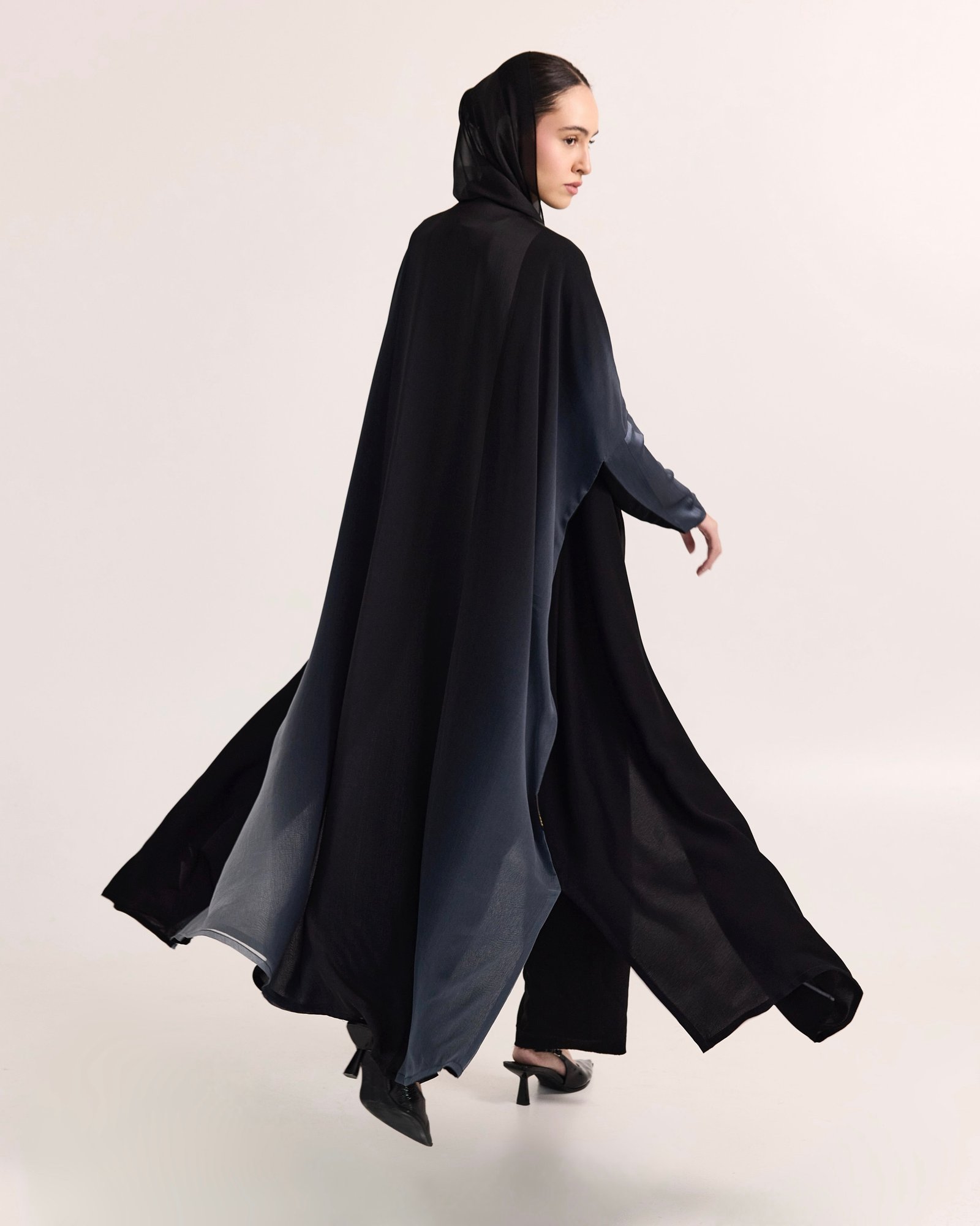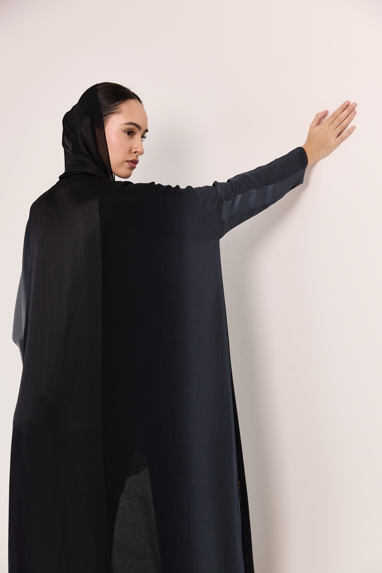 A flowing black abaya designed with a soft, elegant silhouette that moves beautifully with every step. Fully lined for added comfort and structure, featuring a lightweight chiffon outer layer for a refined, airy feel. The matching chiffon sheila completes the look with a graceful, modern finish—perfect for any occasion.